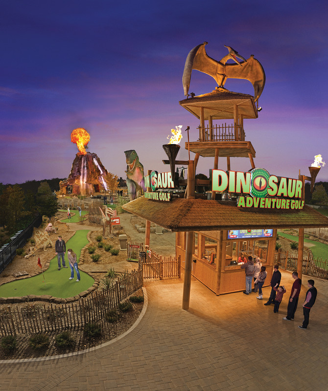 As one of the nation's largest miniature golf courses, Dinosaur Adventure Golf features two 18-hole courses: 'Raptor' and 'T-Rex', 3 distinct decorative ponds with fast-moving rapids and bubblers and a 50 foot high "active" steam-erupting volcano that lets golfers play directly through a realistically eerie, cavernous volcanic interior.