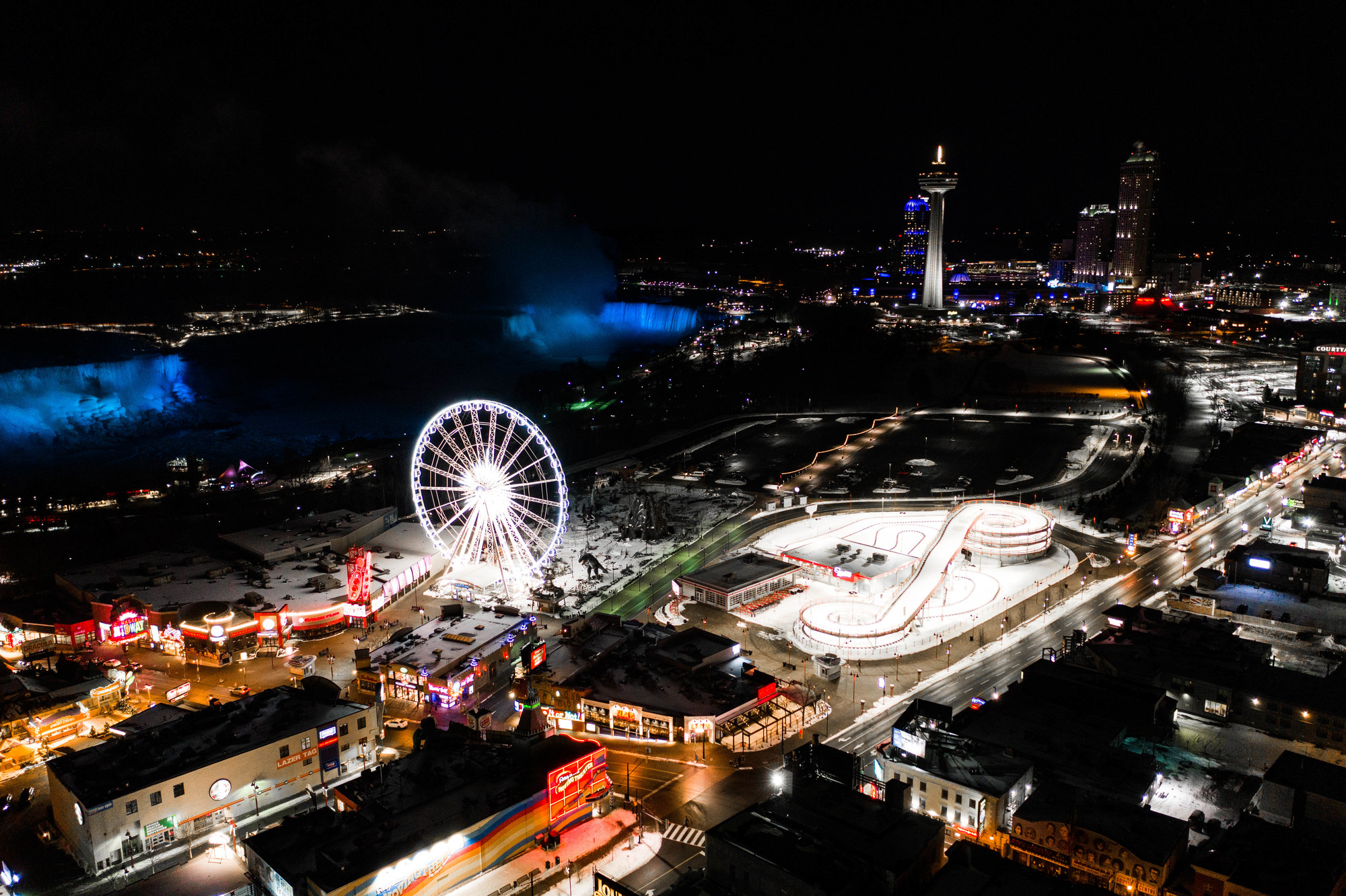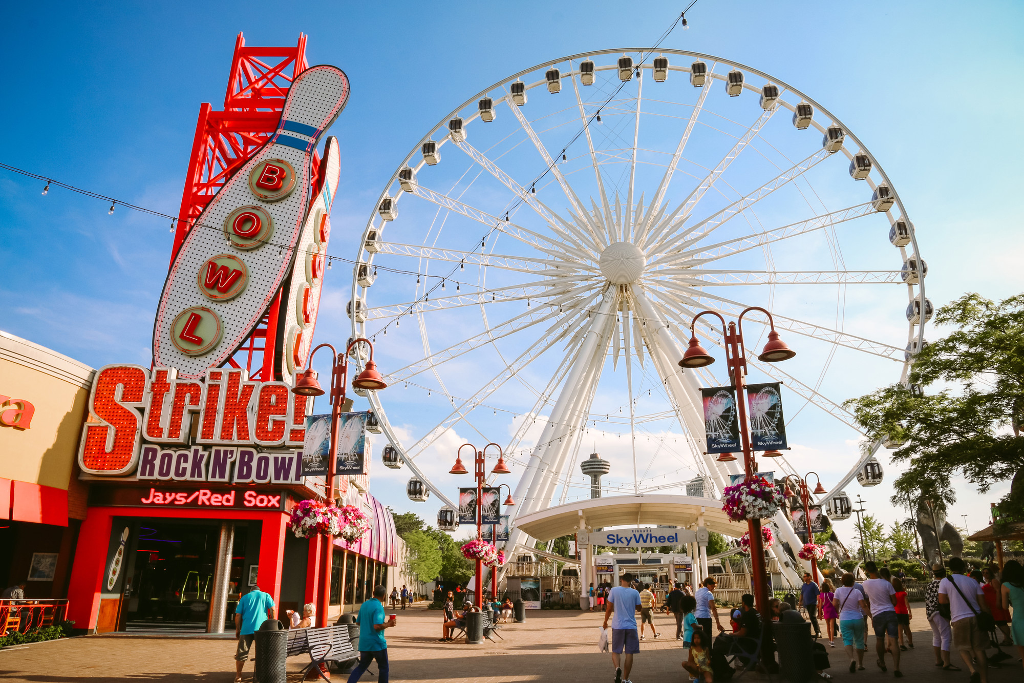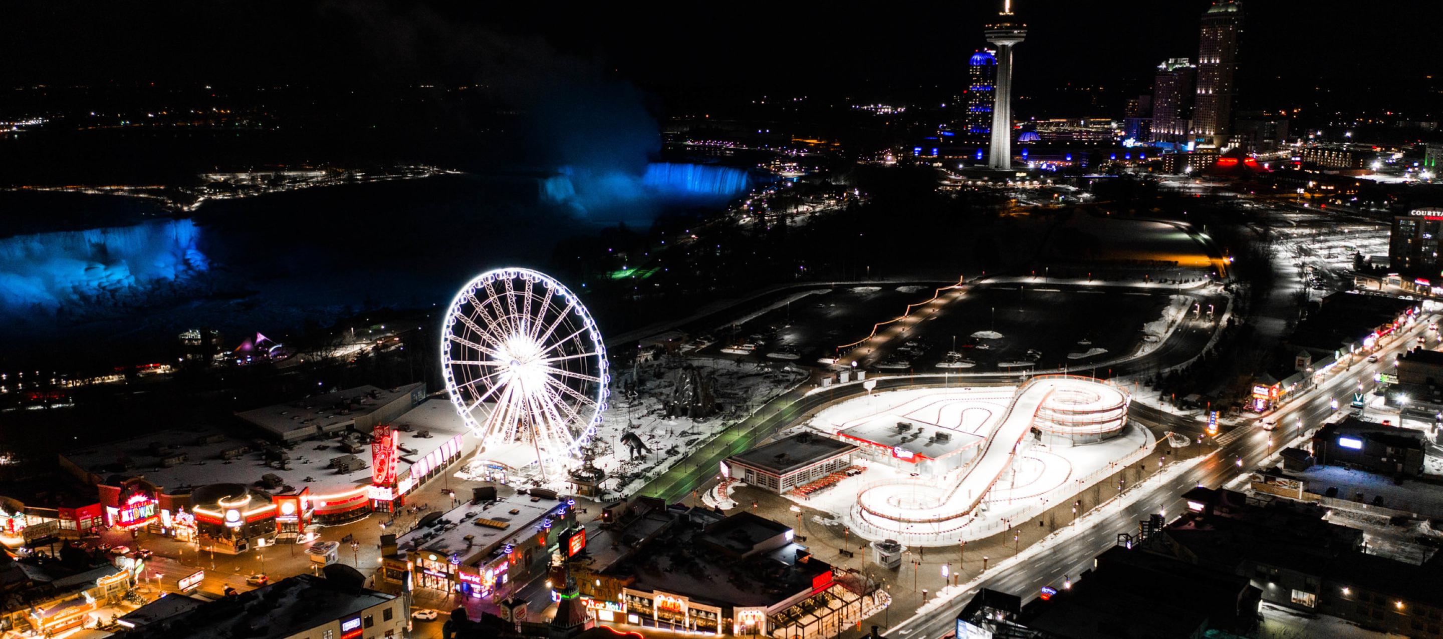 Are you ready for a must-see Niagara Falls attraction with breathtaking views of the Falls and beyond? Visit Clifton Hill in Niagara Falls and take a ride on Canada's largest observation wheel, the Niagara SkyWheel. Towering 175 feet (53 metres) above the Niagara Falls skyline, the SkyWheel offers an unforgettable way to see Niagara Falls from above. From this vantage point, enjoy stunning views of the Horseshoe and American Falls, the Niagara River, and nearby landmarks.