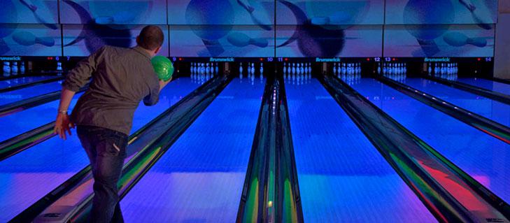 Here you'll find 14 full size 10 pin bowling lanes, a high-def audio/visual system, intelligent LED lane lighting and touch screen monitors for easy, automated scoring. Plus, with special bumper-rails that can be raised or lowered for each player, kids and novice bowlers don't have to throw gutter balls.