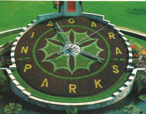 This unique and stunning display is a very popular stop on the Niagara Parkway and is photographed almost as often as the Falls! The planted face is maintained by the Niagara Parks horticulture staff, while the mechanism is kept in working order by Ontario Power Generation. The floral design is changed twice each year - it features viola in the Spring and four cultivars of Alternanthera along with green and grey forms of Santolina Sage during the Summer and Fall. California Golden Privet and Blue Festuca Grass may be used for contrast. The grounds surrounding the clock feature bedding displays and a Tower at the back of the clock houses Westminster chimes that chime each quarter hour. When the door into the Tower is open, you can take a peek at the clock mechanism and enjoy photographs that show the history of every face design all the way back to 1950. Feeling whimsical: there is a 10-foot wide water garden that curves 85 feet around the base of the timepiece - it is a popular place to make a wish!