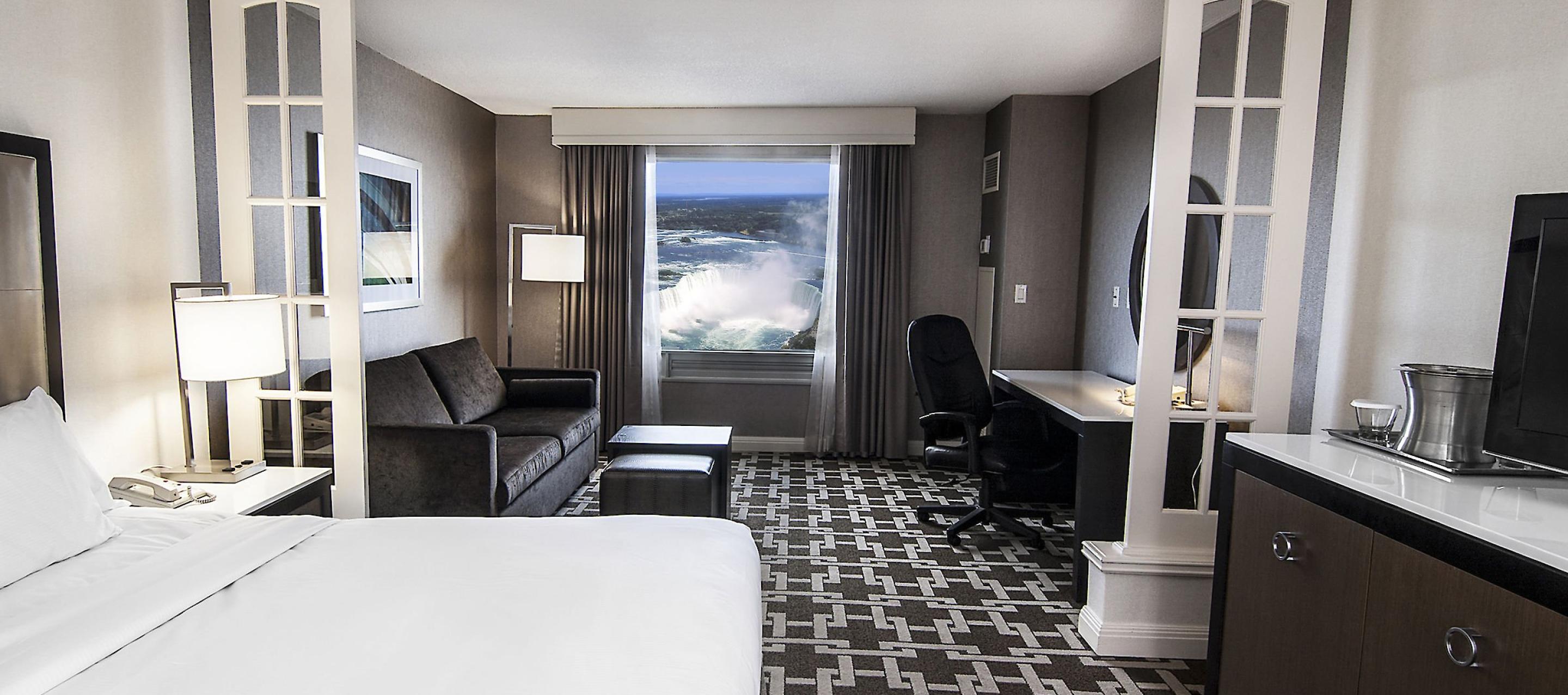 Hilton Niagara Falls is designed with our guests’ comfort and convenience in mind, offering a variety of modern room options, including Jacuzzi tubs, high-definition TVs, and fireplaces. Whether it's a weekend getaway or an extended vacation, you can’t go wrong when making the Hilton Niagara Falls/Fallsview Hotel and Suites your destination of choice when visiting Niagara Falls.